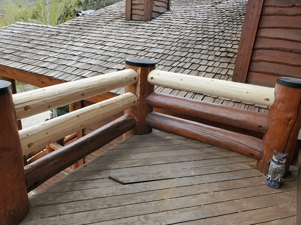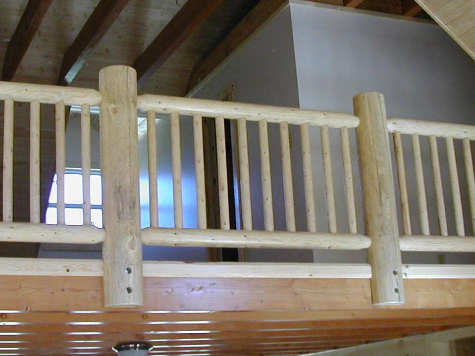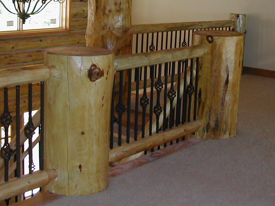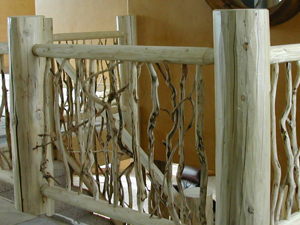 A rustic railing designed for durability. Each log is precisely cut so the railing fits snuggly around each post. Requires stain every 2 years if outside and 10 if inside.See are portfolio of decks for additional pictures. Email us to start the process