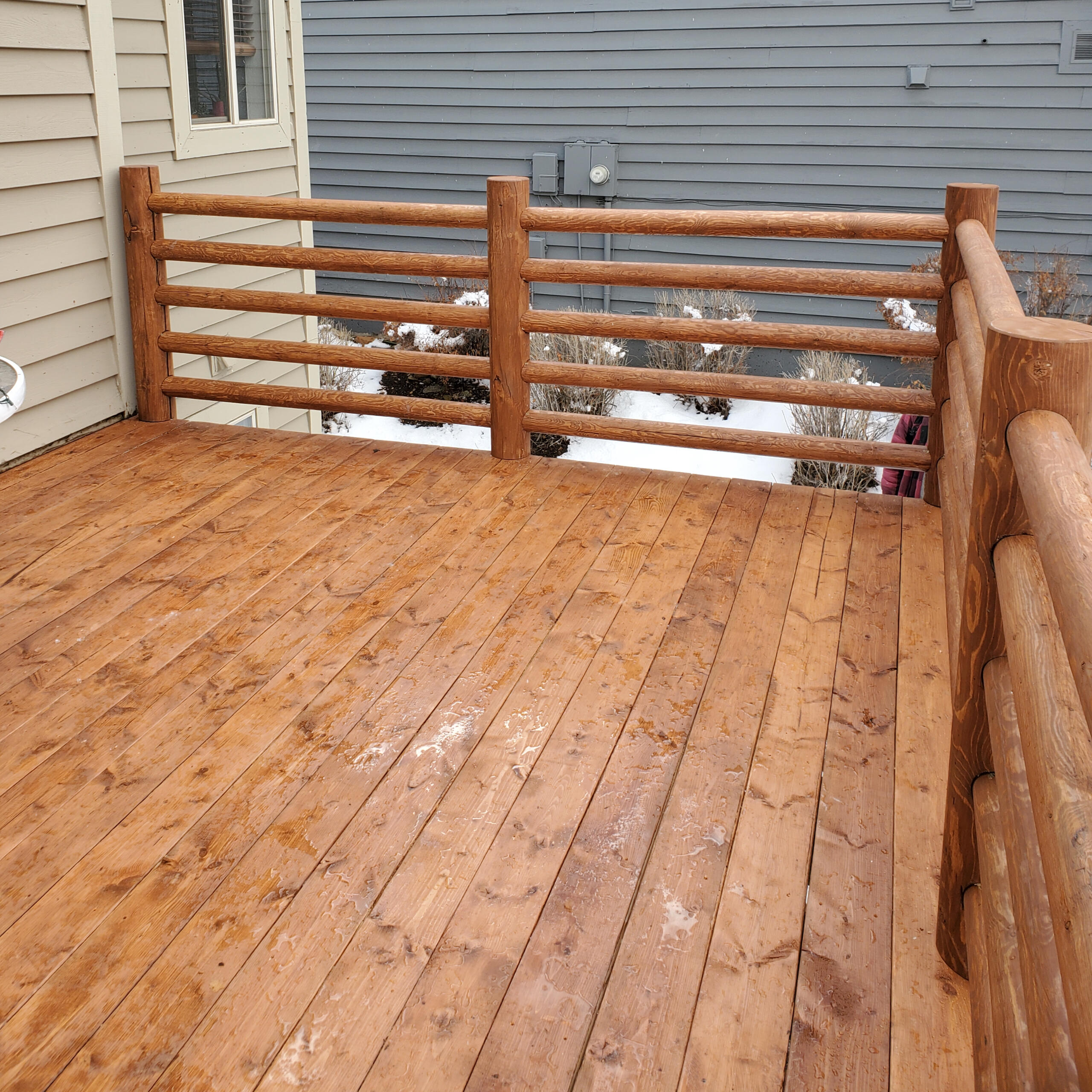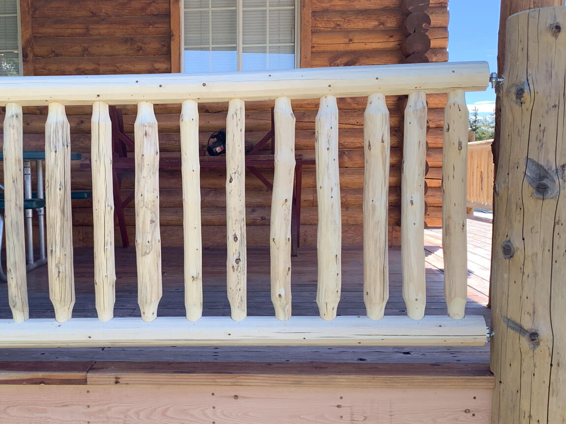 Similar railing design to cleaned peeled but provides a more natural and unique style. Requires a clear coat of stain every 2 years if outside and 10 if inside.See are portfolio of decks for additional pictures. Email us to start the process